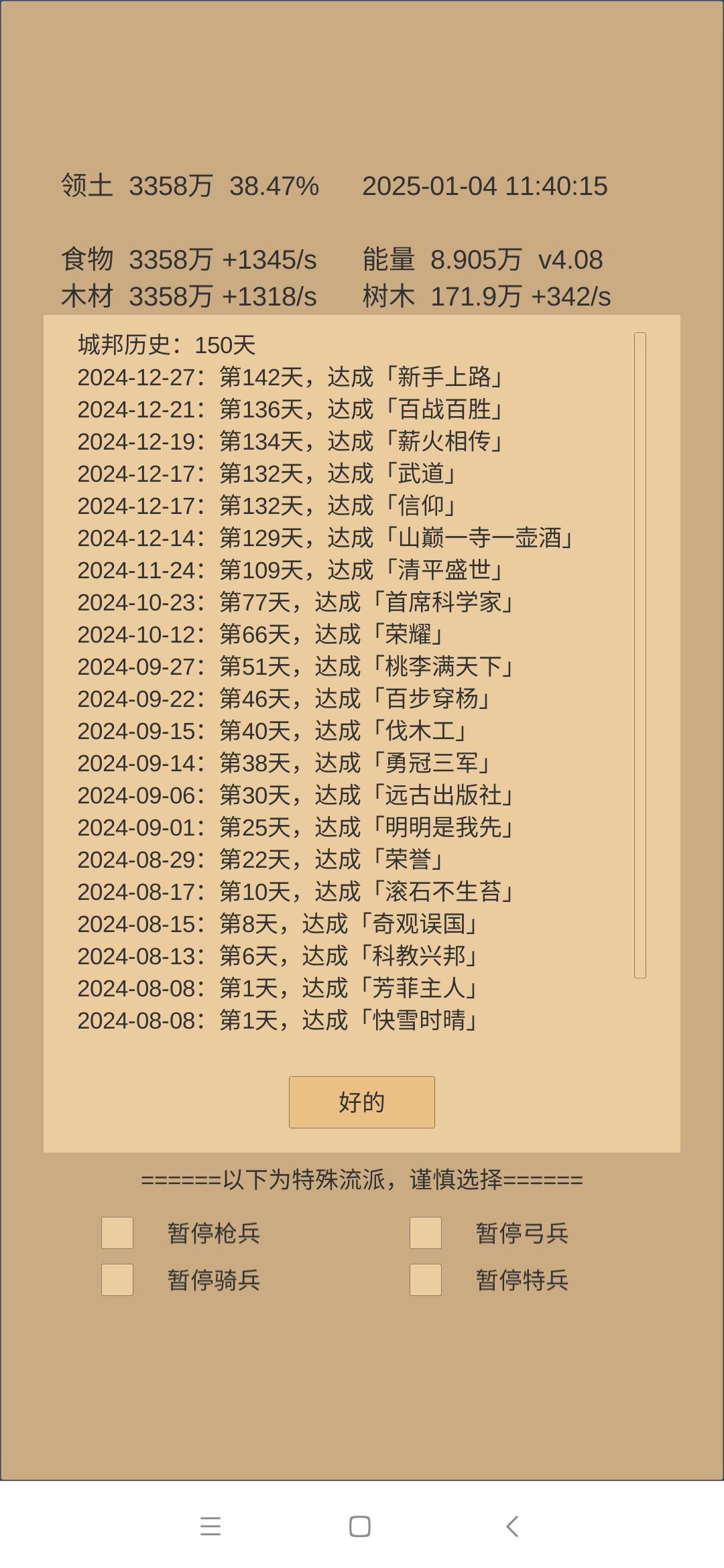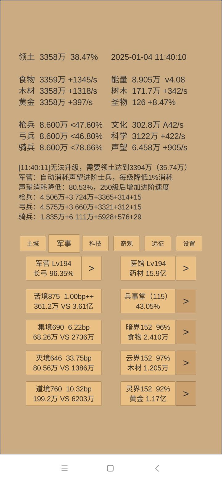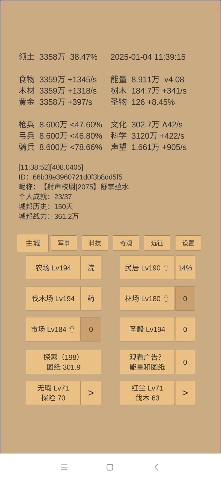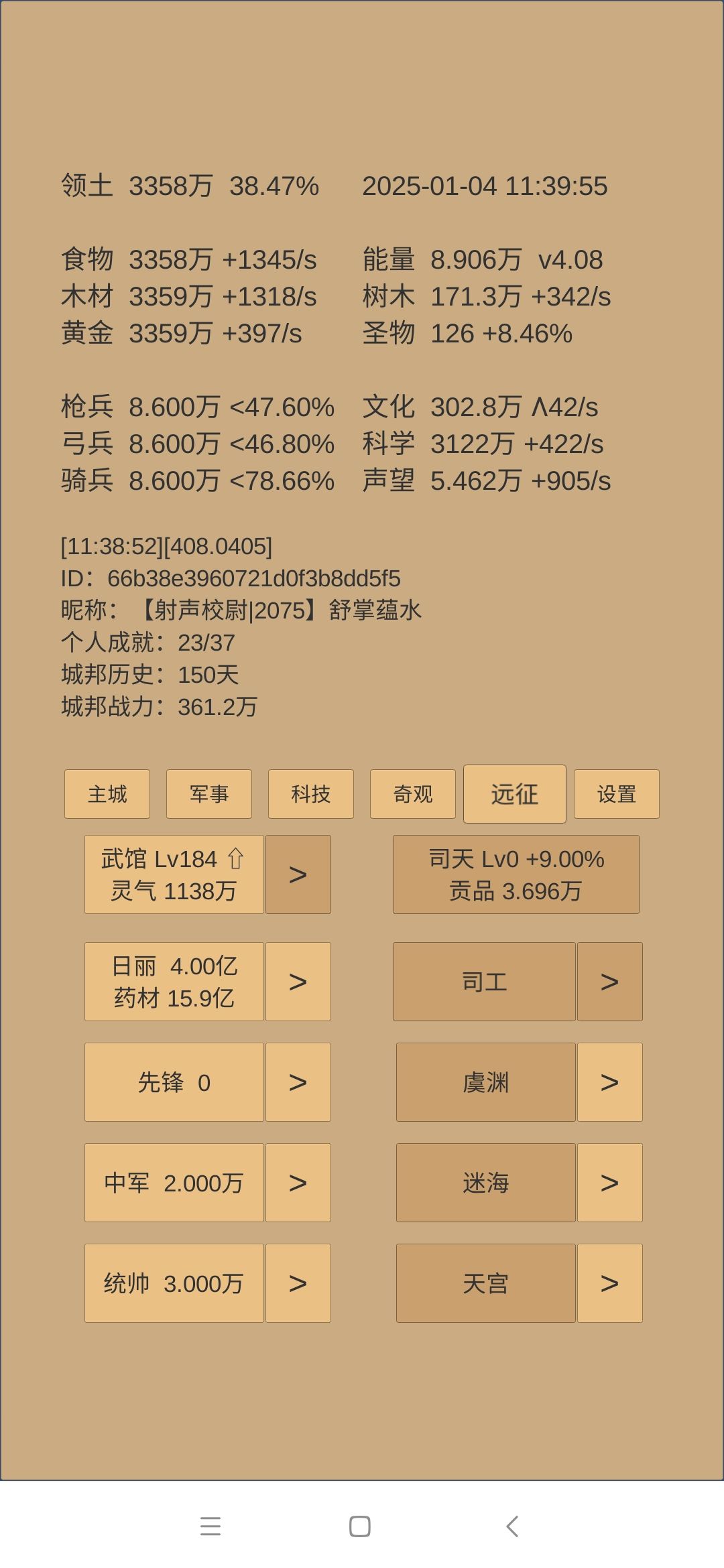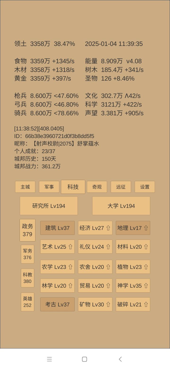 下一步思路:科技方面是考古神学和军训点到40级,然后无瑕升级第一时间儒学惊鸿留芳跟一级。如果还有多余科学,升建筑和物理,目的是试图让军营200级开阵图和铜章。