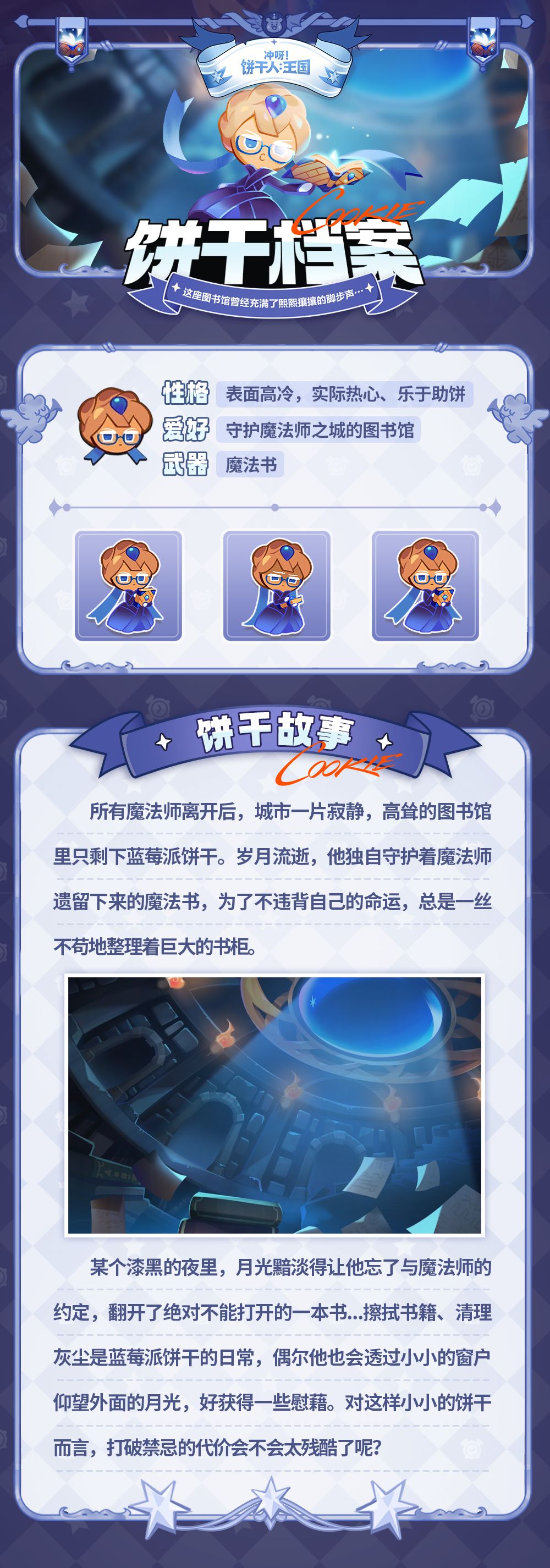 所有魔法师离开后,城市一片寂静,高耸的图书馆里只剩下蓝莓派饼干。他独自守护着魔法师遗留下来的魔法书,总是一丝不苟地整理着巨大的书柜。某个漆黑的夜里,月光黯淡得让他忘了与魔法师的约定,翻开了绝对不能打开的一本书。对这样小小的饼干而言,打破禁忌的代价会不会太残酷了呢?
