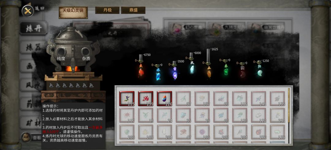 咱们如果有天级幻灵锅这个逆天改命,就会获得一个天极幻灵锅,它可以使我们炼成的丹药100%是一品,并且收获翻倍,但是他不保证不会炸炉,好在我们有一个器灵,他的被动效果是百分百不炸炉,由此我们便可只需将要必要材料放入丹炉,其他的材料都不必放,直接炼制就会获得最大数量的一品丹药!