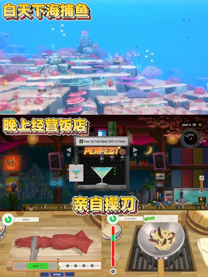 🍣 晚上经营寿司店,用刚捕的鱼制作美味寿司,赚金币升级装备,探索更深的蓝洞!