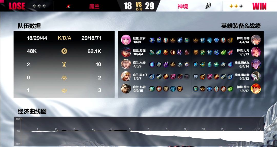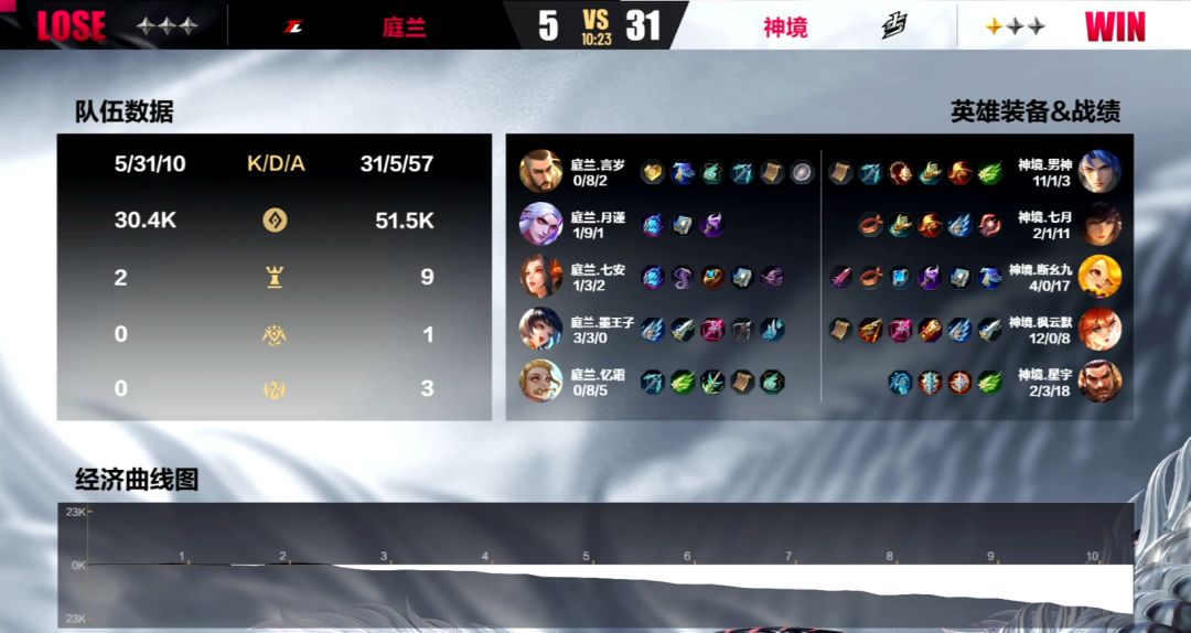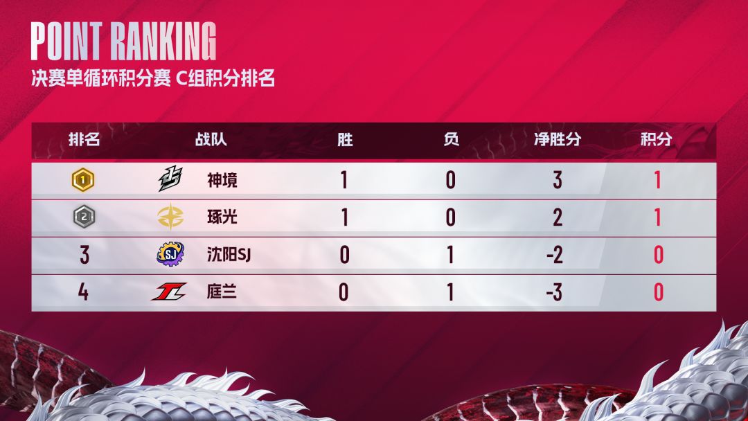 原本庭兰与神境两支战队的实力相近,可是到了决赛期间,同样经历了换人的两支队伍,明显还是神境磨合的更好一些。前两局当中神境几乎是从开始一直碾压庭兰到最后。第一局当神境推平庭兰高地的时候甚至手握了20k的经济优势。显然庭兰战队相比较神境慢热很多,在第二局当中,虽然他们对于神境的节奏依旧疲于应付,但是处于13k经济劣势的他们依旧成功的守住了神境的三波进攻,实属不易。第三局的庭兰终于在开局时找到了一部分自信,前3分钟他们不仅拿下了第一条寒冰支配者,还建立起了3k的经济优势。然而神境在中期发力,12分钟时,双方在凛冬支配者处决战,神境抓住机会打了庭兰一波2换4,顺势攻上高地,3:0战胜对手,暂时位居C组积分榜首位。