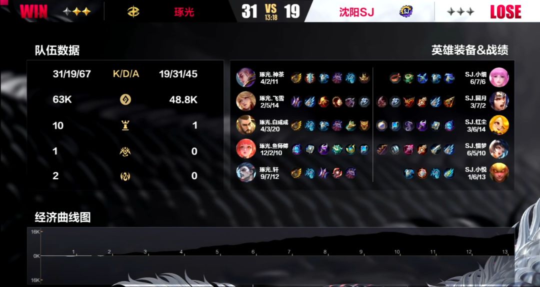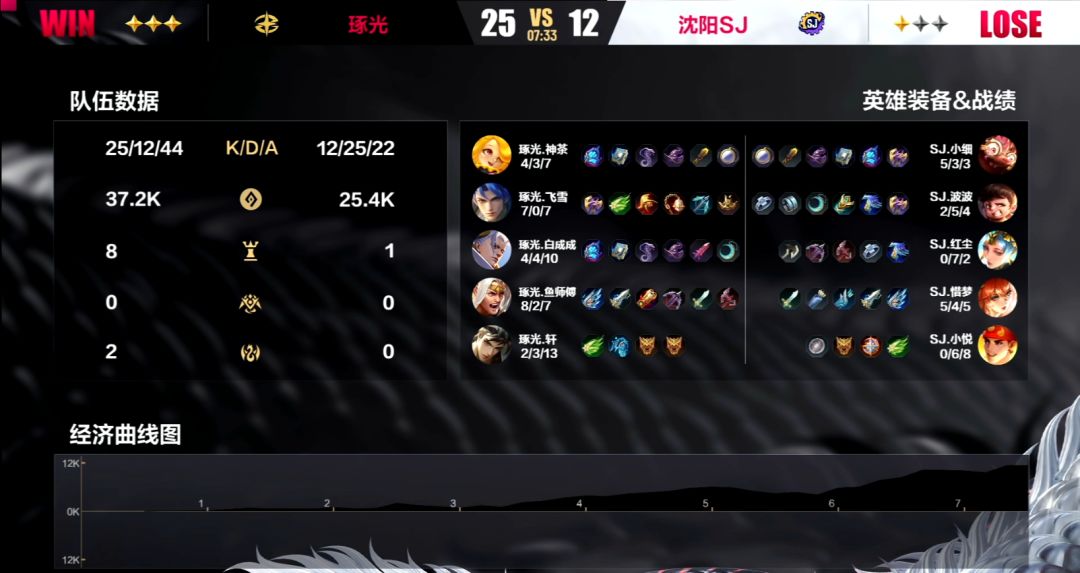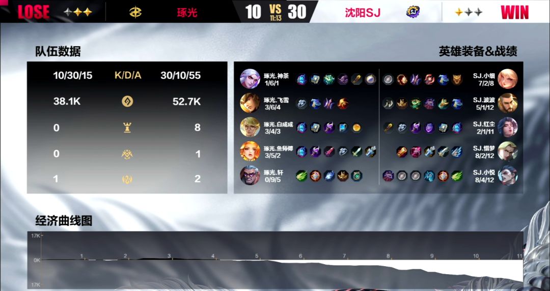 琢光作为本届冰雪杯的夺冠热门战队之一,在本场对战沈阳SJ的时候再次展现出了他们恐怖的战场统治力,沈阳SJ在面对他们的时候抵抗的非常艰难。前两局当中,琢光战队都是在前5分钟就取得了6k左右的经济优势。但在第二局当中,即便是在琢光手握10k+的碾压经济优势的情况下,沈阳SJ依旧死守水晶,三度击退试图一波的琢光战队——虽然最终不敌,14分钟被琢光推平,但在下一局当中沈阳SJ再次展现了他们是一支非常值得尊敬的队伍,他们向我们展现出了他们出人意料的韧性和游戏精神。面对强大的对手,他们不仅没有退缩和畏惧,在第三局当中他们抓到了琢光在阵容和操作上的破绽,步步为营,终于在11分钟的时候,带着14k的经济优势扳回一城!虽然到了第三局面对盛怒之下的琢光,7分半钟被对手拿下,3:1惜败,但还是相信如此有韧性的他们能够在之后的比赛中能够战胜其他队伍取得更好的成绩。