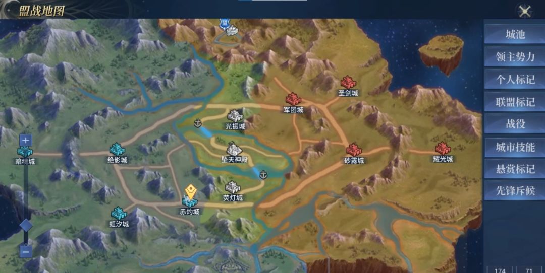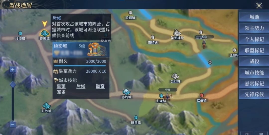 例如斥候,占领该城池后,联盟可派遣斥候自动铺路至目标地点;还有要塞,占领后可将部队调动至该城镇。,还有贸易、重镇、前线、振奋等等,根据联盟的布局思路选择攻占目标。