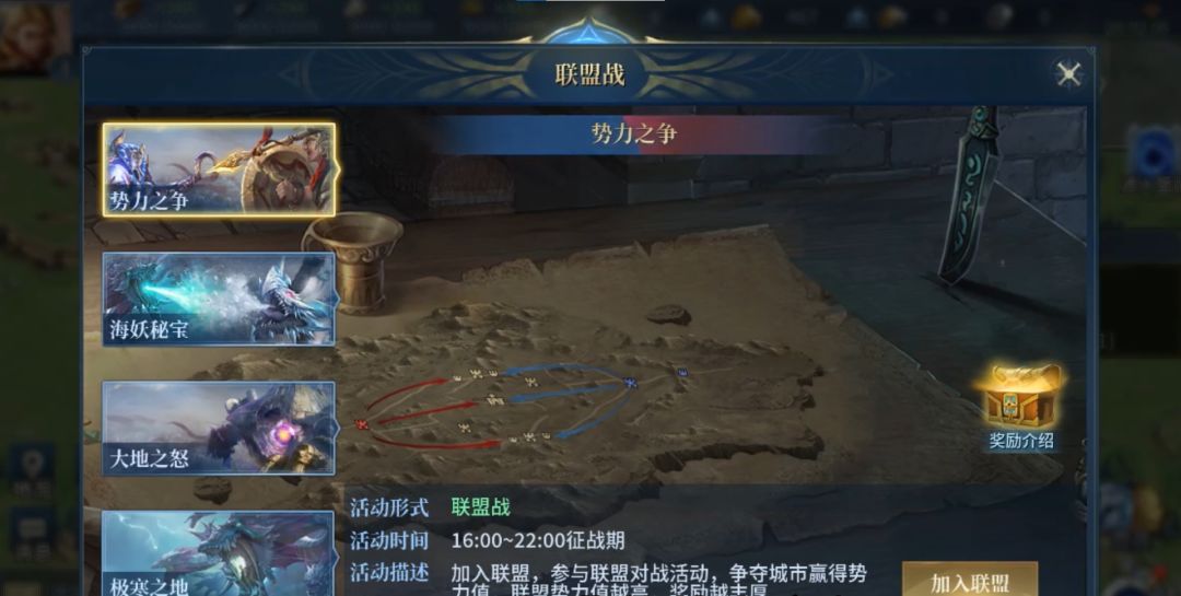言归正传,盟战地图目前有四张,分别是最经典的势力之争、岛屿众多的海妖秘宝、争夺宝藏的大地之怒以及竞争最为激烈的极寒之地。