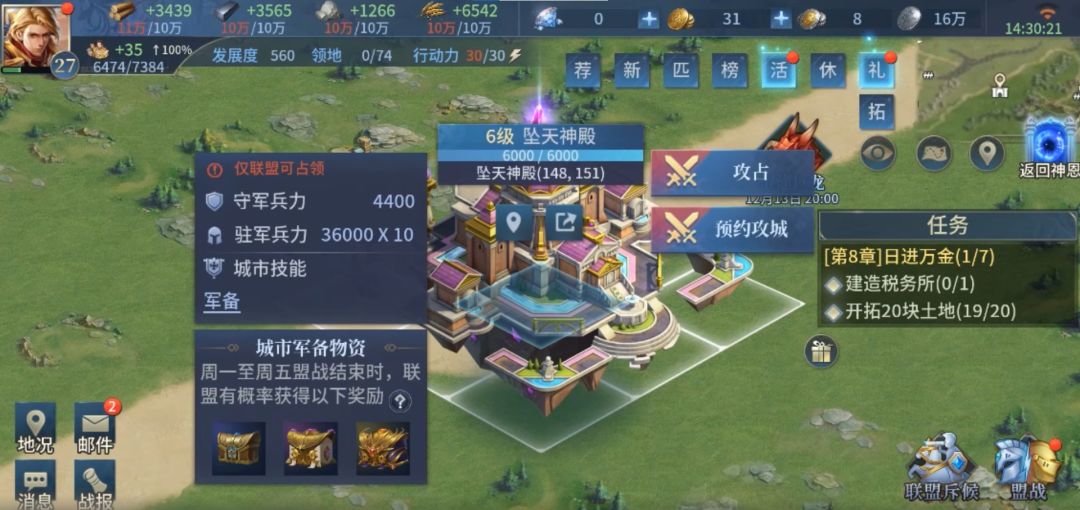 中心神殿不仅是整个地图的交通中枢,更是双方势力的必争之地。占领中心神殿除可以获得同周五活动boss的3000势力值外,还能获得比普通城镇更好的城市军备物资。