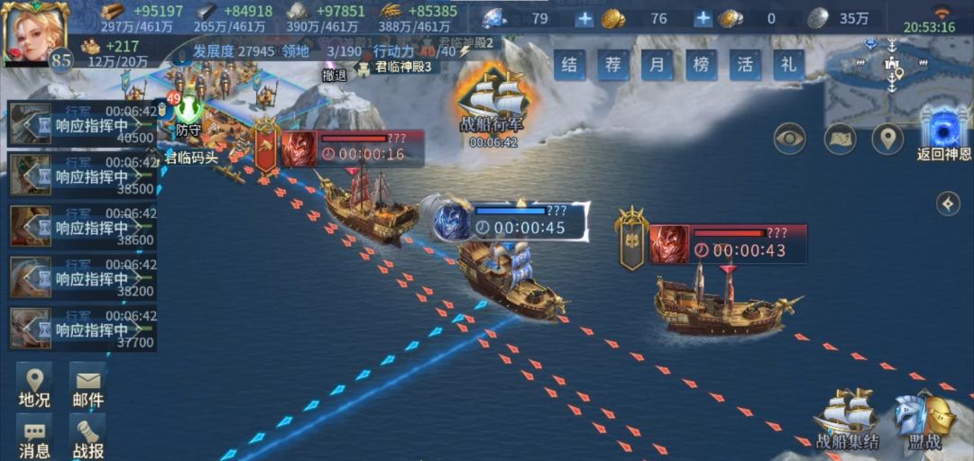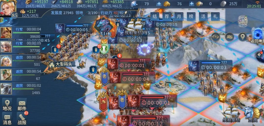 在讲解盟战地图之前先来了解一下盟战一些机制。首先是开放时间,盟战只在下午4点至晚上十点开放,其余时间地图内的一切活动都将暂停,包括要塞的建造、升级时间,只能进行部队的调动。与神恩地图的联系和区别请看本系列的第一期。