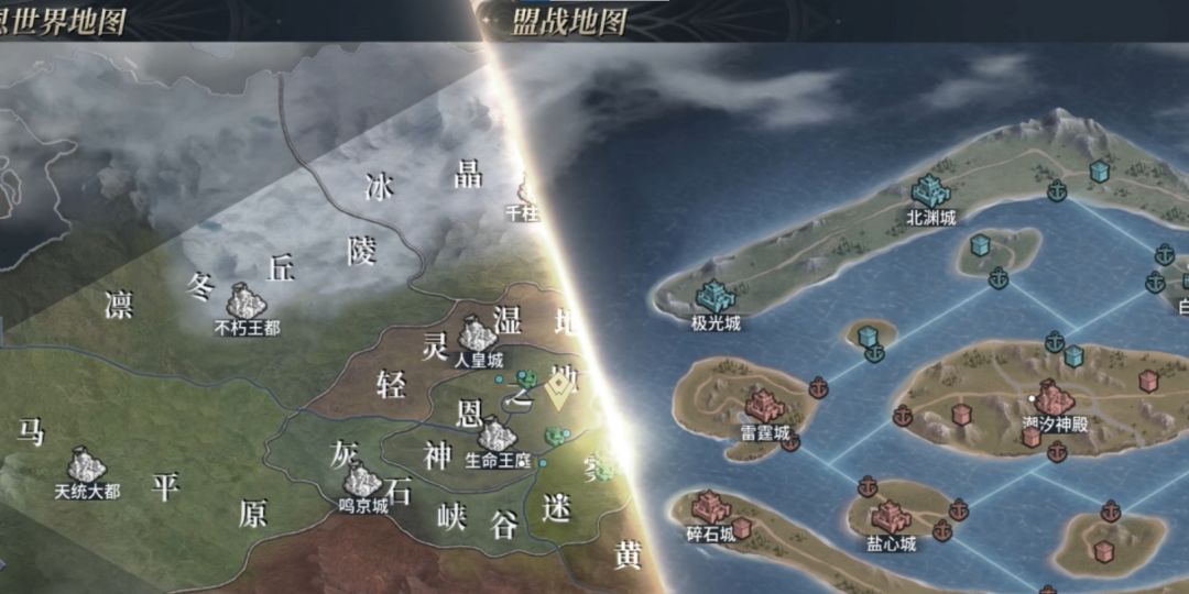 虽然盟战地图有四张,但其结构却大体相似,可分成三部分:活动区域、常规城池和中心神殿。