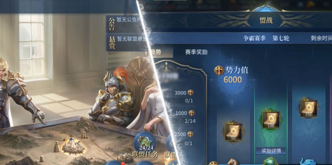 其次是势力值的介绍,每当我们占领盟战图中的城镇或者一些特殊建筑时都会获得势力值。它关乎于盟战结束时的奖励结算,打开右下角盟战界面即可看到当前势力值。势力值越高获得的奖励就越多,包括荣誉卷轴和赛季段位等。
