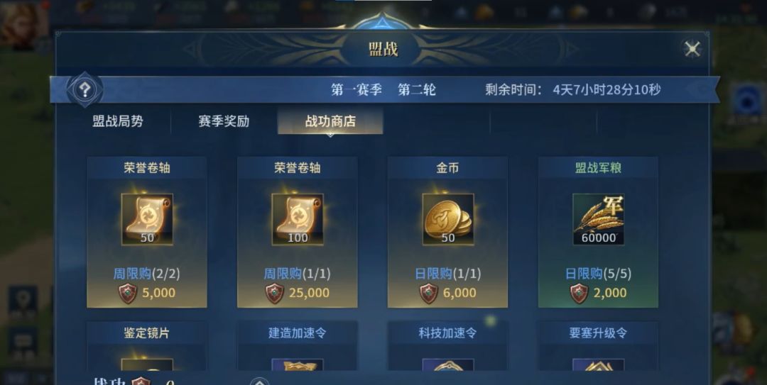 然后是荣誉卷轴和功勋。两者都可以在英魂商店兑换稀有道具和资源。荣誉卷轴只有两种途径获取:1.通过战功每日购买;2.轮次结束根据所获势力值量级结算领取。而功勋只能通过盟战轮次结算时领取。同时盟战的赛季段位也是依据势力值量级进行结算。