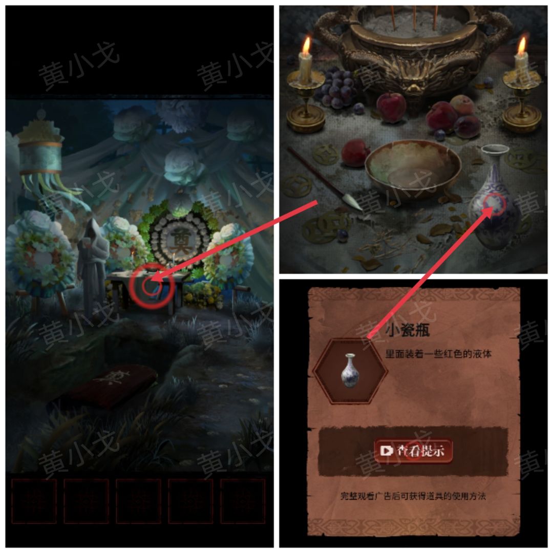 3.点击供桌,用蜡烛点燃【符纸】;把【小瓷瓶】里的红色液体倒入瓷碗;拾取【毛笔】