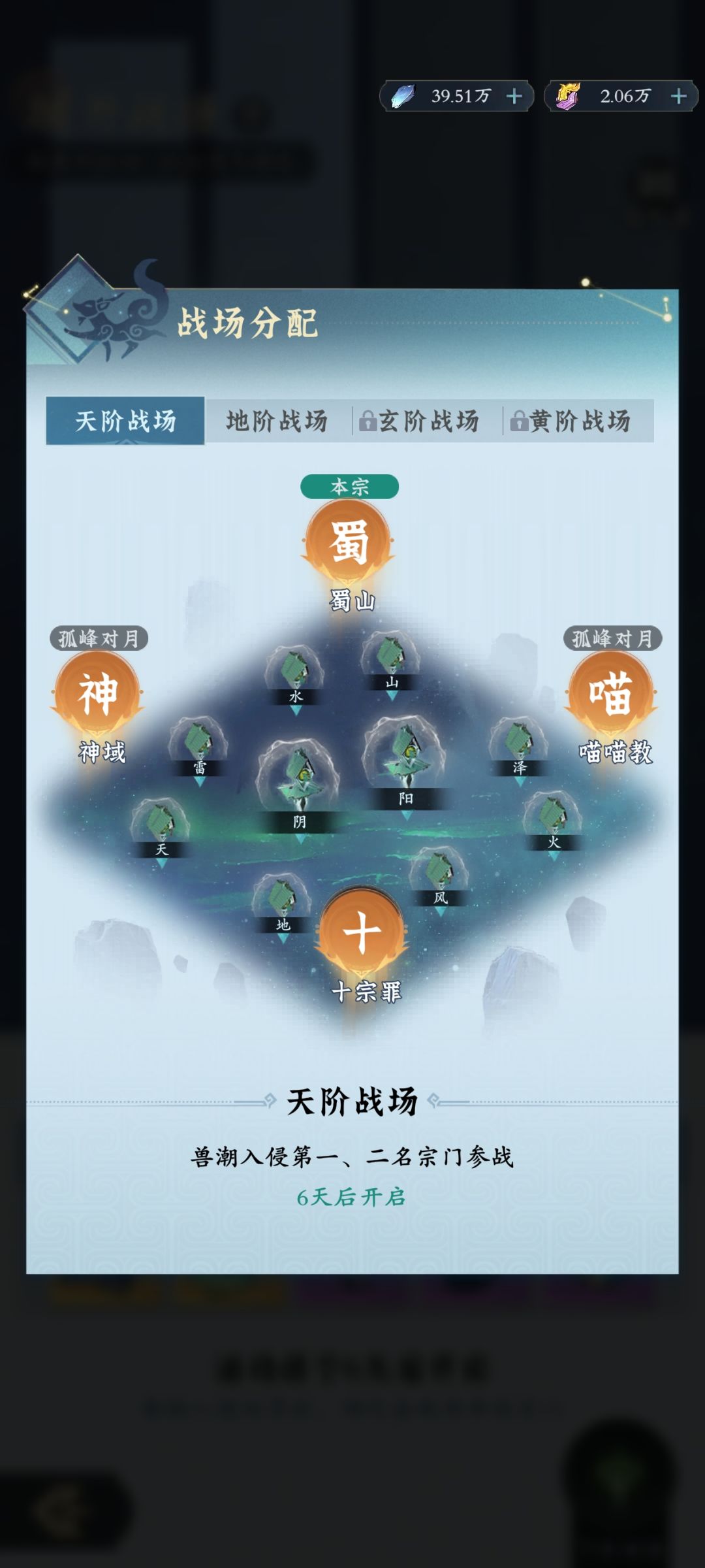 天阶战场有神域、蜀山、喵喵教、十宗罪。地阶战场有炎盟、不争朝夕、烟雨楼、华山。