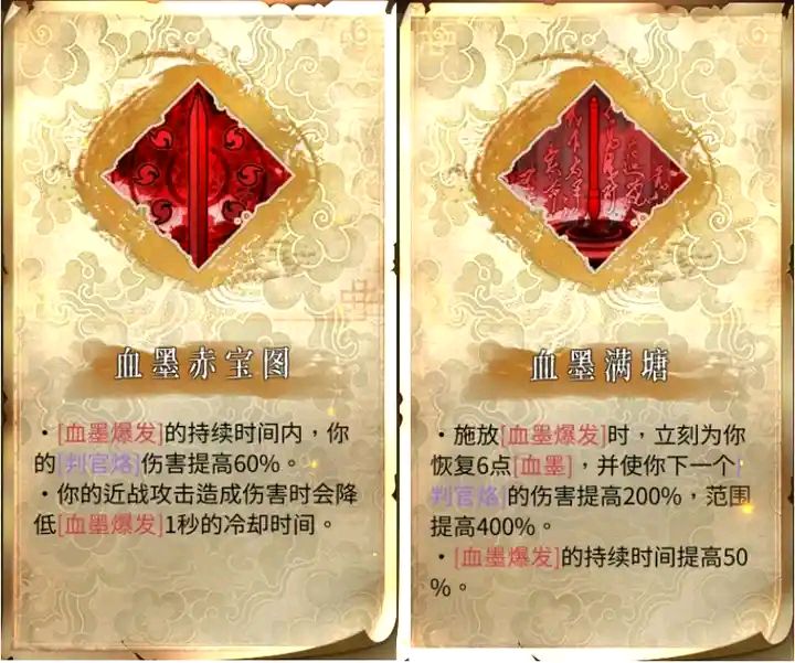 【血墨赤宝图】:血墨爆发的持续时间内,判官烙伤害提高60%。计算公式为1.6*0.8*飞剑攻击。你的近战攻击造成伤害时会降低1s血墨爆发的冷却时间。