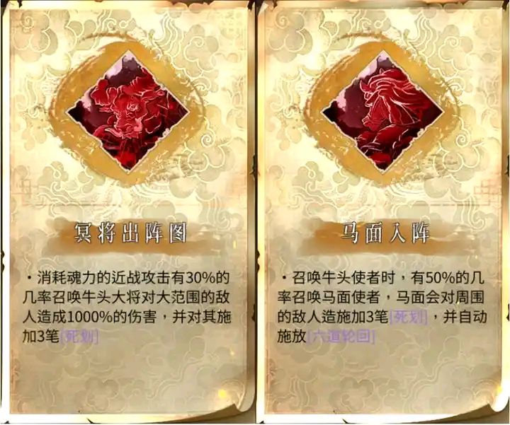 【冥将出阵图】:消耗魂力的近战攻击有30%几率召唤牛头大将造成10倍伤害,并施加3笔死划。10倍伤害,吃平均攻击,计算公式为10*平均攻击。3笔死划,3次倍率0.4真伤。
