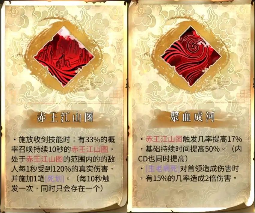 【赤王江山图】:【魂将、判官通用】收剑时有33%几率召唤持续10s的赤王江山图,处于赤王江山图范围内的敌人每秒会受到倍率120%真伤,并施加1笔死划。真伤计算公式为1.2*平均攻击。