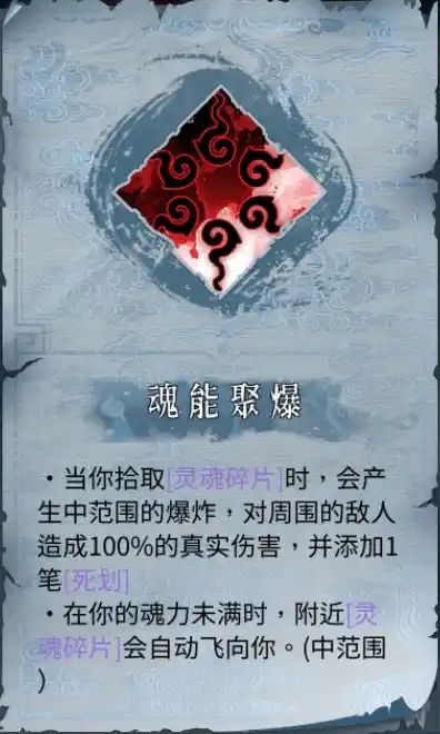 【魂能聚爆】:当你拾取灵魂碎片时会产生中范围的爆炸,对周围敌人造成100%真伤,并施加1笔死划。在你魂力未满时,附近中范围的灵魂碎片会自动飞向你。(一次收剑六道轮回刚好施加6笔死划,一共6次真伤,6次死划倍率0.4真伤,一次生老病死倍率1500%真伤。)