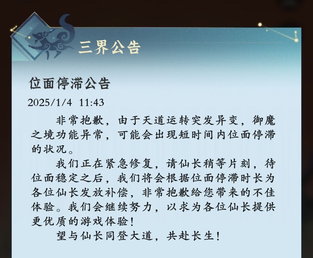 针对1月3日的登录异常,发放了400仙玉的位面停滞补偿、对未正常获取奖励的玩家发放了600魔气精华+100仙玉的活动补偿。针对1月4日的登录异常,发放了600仙玉的位面停滞补偿(由于是二次发生,拉高了补偿额度)。对于上述情况我们一定秉持公平原则发放位面停滞补偿。并且对由于异常造成的活动奖励缺失、回档等异常,会根据仙长实际损失进行对应补偿。