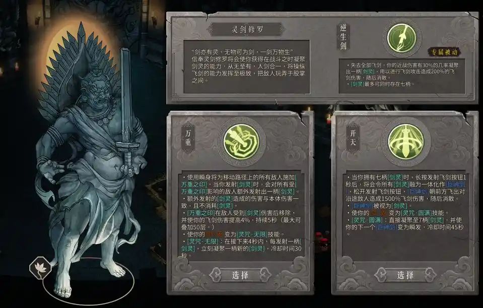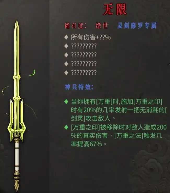 【万重】:瞬身施加万重之印,当你发射剑灵时,会对所有受万重之印影响的敌人额外发射1柄剑灵。万重之印在于剑灵抵消后,会使你的飞剑伤害提高4%,持续5s,最多50层,叠加计算,计算公式为2*飞剑攻击*(1+0.04*层数),(特别的地方,体现在面板上,而且这个区间是和见闻录收集加成区间属于同一个)。