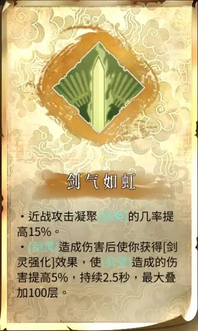 【剑气如虹】:剑灵造成伤害后获得剑灵强化效果,使剑灵造成的伤害提高5%,持续2.5s,最大叠加100层。(叠加计算,注意受万重之印影响额外发射的剑灵也是剑灵,所以一次上印,发射剑灵两次,叠了2层,为10%,且此时被动提高4%,一层。)