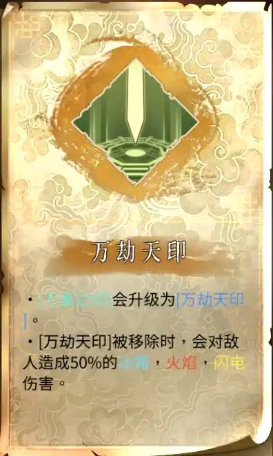 【万劫天印】:万重之印升级为万劫天印,万劫天印移除时,会对敌人造成50%的冰霜火焰闪电伤害。实测,由于这50%的冰霜火焰闪电伤害是在万劫天印移除后造成,所以能吃到万重之印被动飞剑伤害提高4%的飞剑攻击,吃此时的平均攻击,吃各自属性伤害,计算公式为0.5*此时的平均攻击*(1+各自属性伤害百分比)。