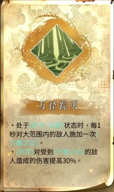 【万径踪灭】:处于灵咒●无限状态时每一秒对大范围内的敌人施加一次万重之印。剑灵对受到万重之印的敌人伤害提高30%。计算公式为2*飞剑攻击*1.3。
