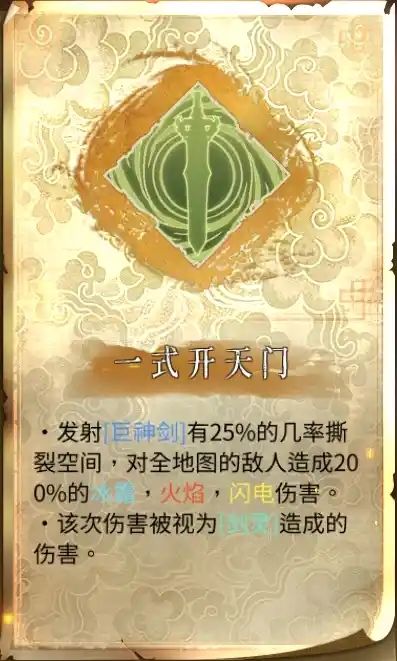 【一式开天门】:参考万劫天印,吃平均攻击,吃各自属性伤害百分比,计算公式为2*平均攻击*(1+各自属性伤害百分比)。