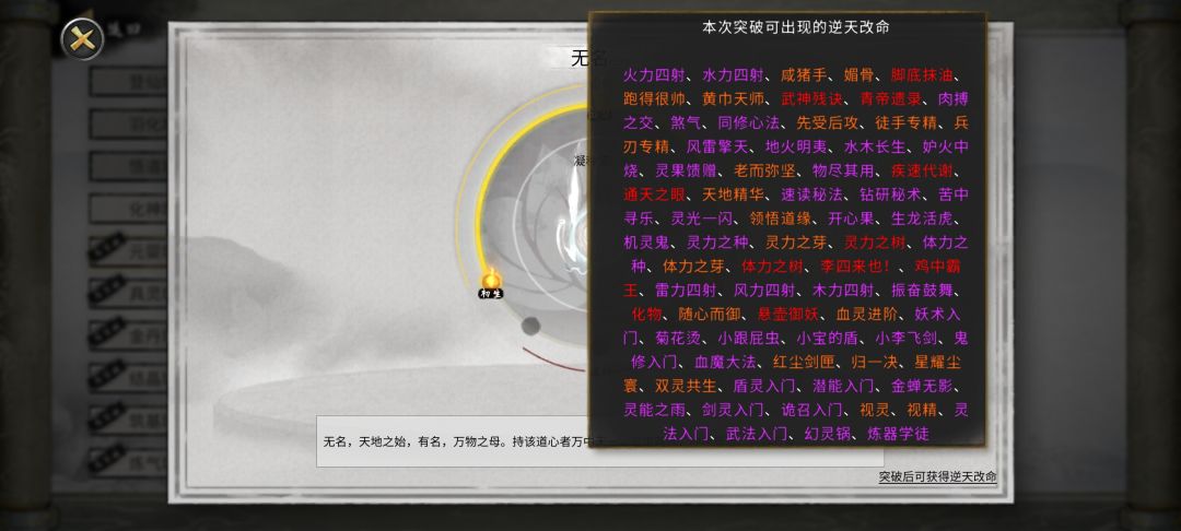 在永宁洲第3年1月份会有拍卖,在这之前当上宗主会有太古残卷,可以刷新宗门逆天,使用前保存一下,可以刷需要的逆天,所以开局什么宗门逆天不重要,还有就是无名之道涵盖万千,说白了就是池子太大了,随到想要的逆天,机率太小了,可以把池子变小一点,换个道种,道心破碎之后,自己会恢复,会随机变成其他的,可以存档读档刷,亲朋好友也能传授(天骄)过月的时候会找你,接受或者拒绝看你需求,办法很多,都有有攻略~我们的终点就是你们的起点,这就是为啥人类比其他物种高级的原因之一