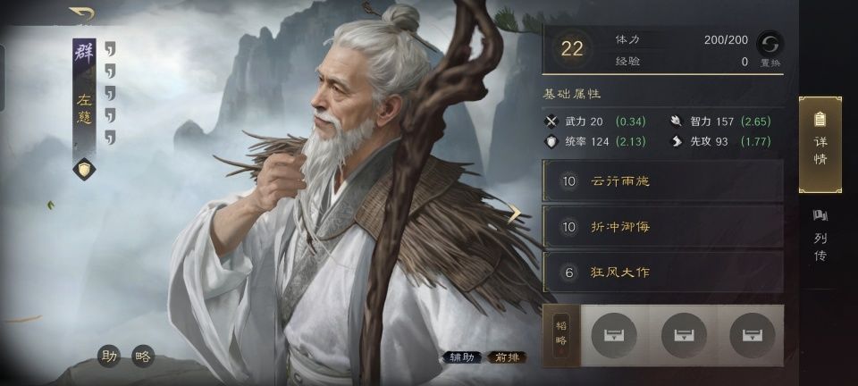 左慈战法:云行雨施+折冲御侮+狂风大作。此战摆出箕形阵,左慈在前排给身后的周瑜和小乔打掩护。除了要肩负起肉盾的职责,他更是周瑜和小乔稳定发挥的保障!