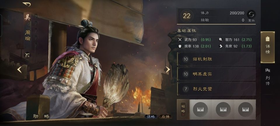 周瑜战法:临机制胜+明其虚实+烈火焚营。扛起进攻的重任,周瑜在这支队伍里是责无旁贷的。值得注意的细节是,左慈在之前吹了风,正好风助火势,让周瑜的烈火焚营更为炸裂。作为主动战法的明其虚实,也因为左慈的云身而更加顺畅的发动。