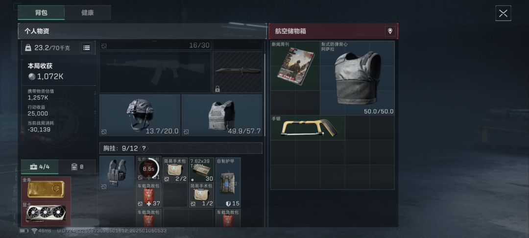 图二是新号第二把,刷了破壁任务就一个小金,做完后搜了重要物资点,疑似第一把出货价值高爆率拉胯,最后也就四个小金,快速回家尝试刷新爆率。