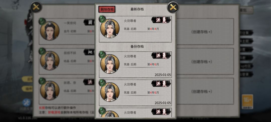 洪荒炼妖壶或者昊天镜破碎请立即读挡多一命哦,不然挂掉直接删档,就要重新捏脸重来了,长按存档可以自由选择读档时间段