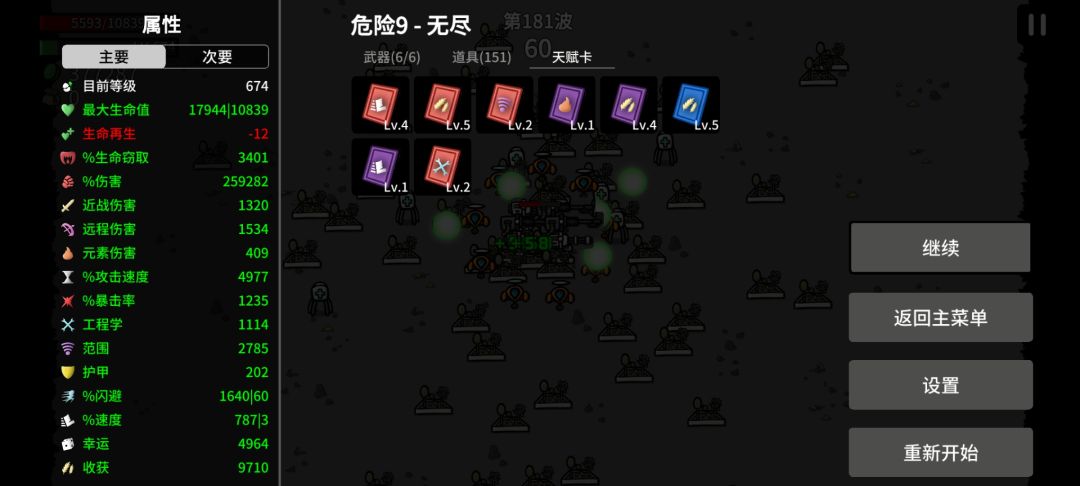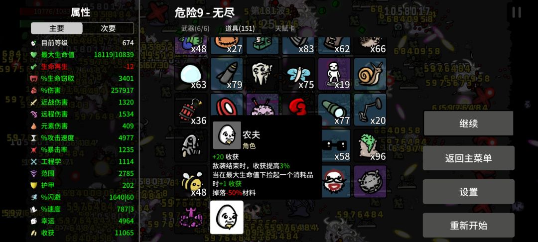 2.天赋卡等级也不算太高,就玩了几天,是人物都还没解锁完就能有的等级,就能一路横扫,而且身上还有52个水熊虫,预估打到300层都没问题,而且这次开局不算好【加收获的王冠】,出现的太晚了,比上一次开局,20层的时候少了几万收获。
