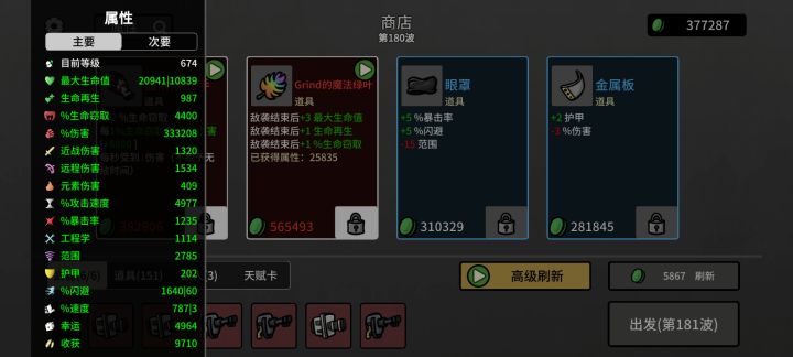 2.3 武器选择远程的,贯通反弹拿上十几个都不打紧,最终武器推荐加特林激光枪+链枪。3+3,4+2都可以。等到商店道具涨起来的时候,商店道具只买+生命窃取,+远程攻击力,血手,绿叶,和水熊虫,BOSS增伤道具,别的都不买。关于升级,20层以后,升级就可以只选生命窃取和远程攻击力这两个选项了。