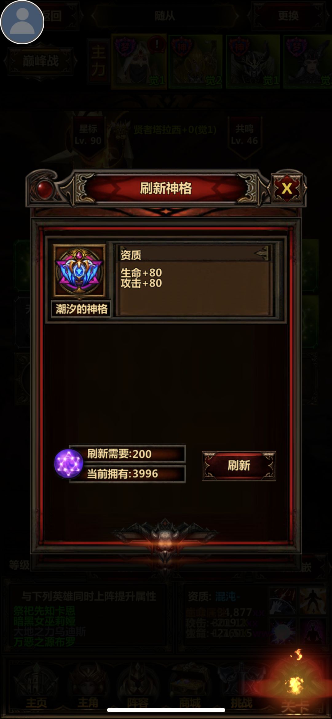 所有随从的资质。资质划分绝世-梦幻➕-梦幻-神话-史诗-非凡。 等神格开了,可以在原基础上提升资质。但基础资质不变。洗神格需要信仰点。(信仰开大教堂和预言所。整体等级越高越好,这玩意缺的很。所以前期洗点尽量用在前三个可洗位置。相对便宜。)神格目前我洗出来最高只有粉色。粉色提升160点。红色提升80点。依此类推。(图5、6)