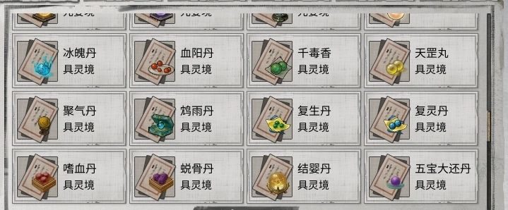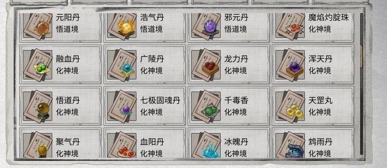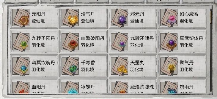获取后需在祖师云房升级:鸩雨丹、天罡丸、千毒香、元阳丹、邪元丹、浩气丹