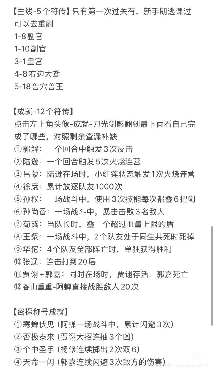 如鸢共能获取17个普通符传,主线可能漏掉的有5个,其余都是必须通关的关卡不计算,成就能获得12个。