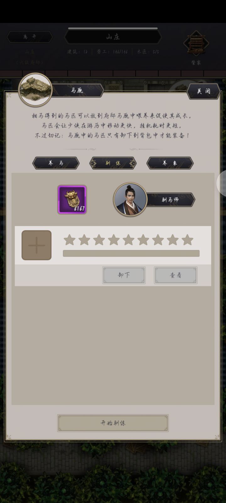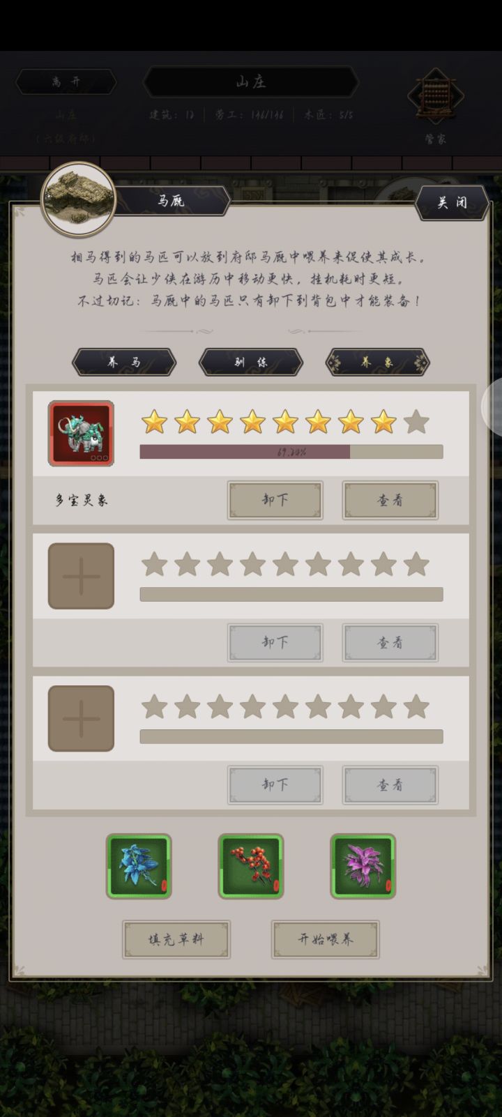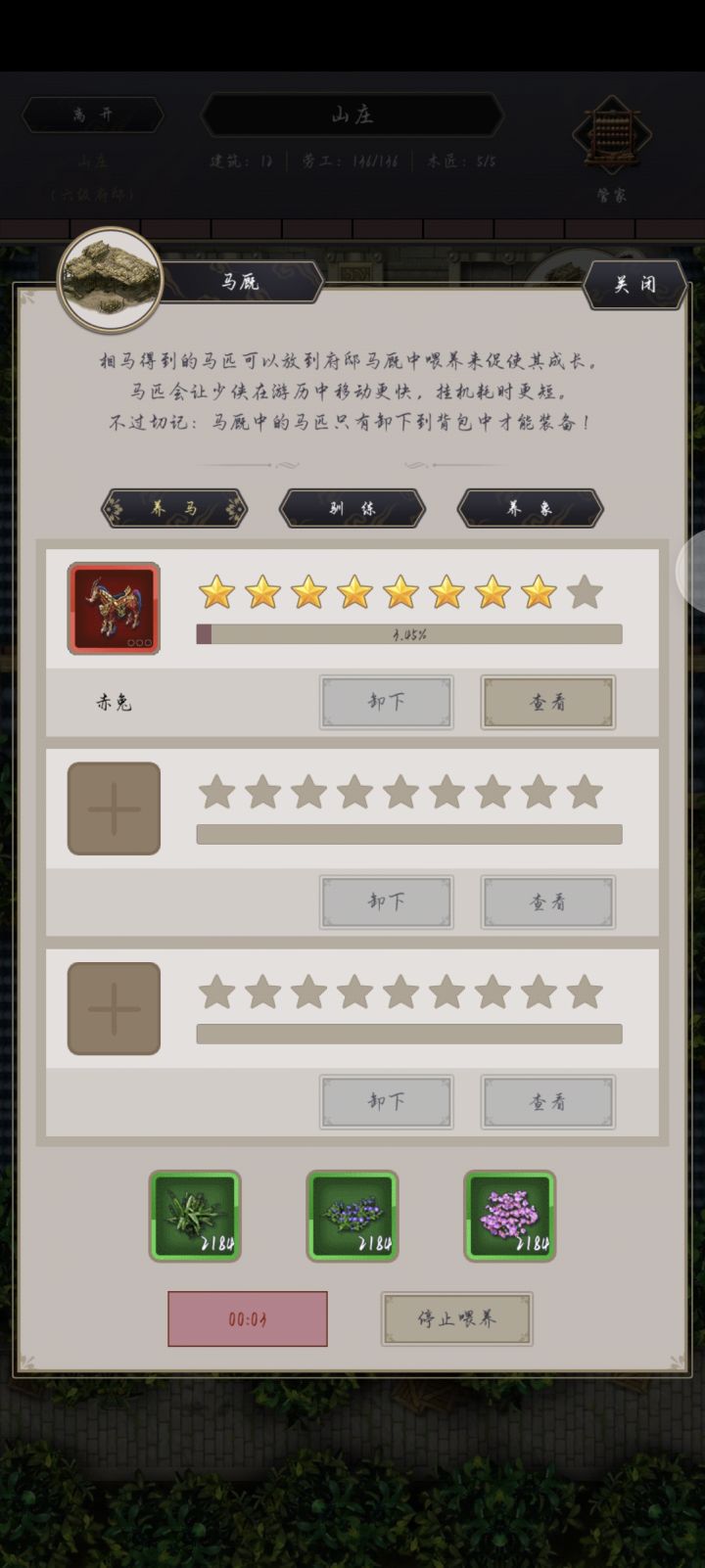 建号历时110天终于拿到赤兔了,换到了灵象,红象吃满草需要9999+9999+2007,所以买满一天的草是不够的,建议早点拿象的驯兽术,买2007个象草存马厩,这样拿到第一天就能拉满,不拖节奏。