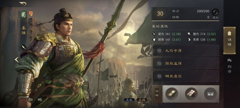 姜维战法:九伐中原+胜敌益强+明其虚实。韬略库:文武手抄+金鼓善本。总体上来看,这支队伍非常的侧重于生存续航。这很明显,是想要依靠九伐中原的姜维,把战斗的节奏尽可能的往后拖。只要战斗持续越久,姜维的伤害叠加就会越高,这无疑充分的调动起了姜维的特性。