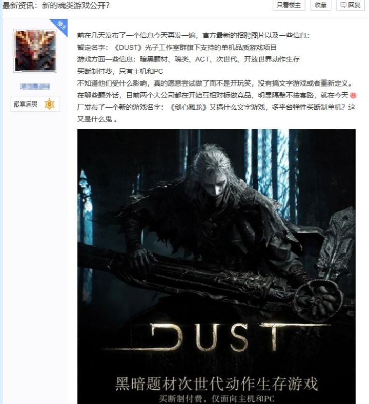 近日,有网友在贴吧上爆料,腾讯光子工作室正在秘密研发一款暗黑题材的魂类游戏《DUST》。