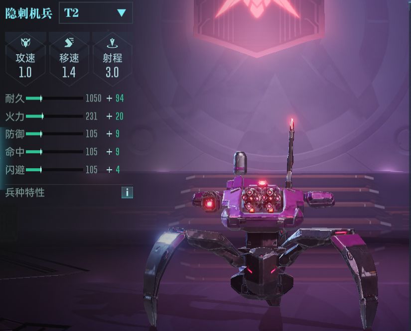 隐刺机兵也是小体型兵种,特点是攻击速度快,具有一定闪避能力,同时可以手动进入隐身状态。脱离隐身状态会获得伤害和闪避加成,同时从背面攻击敌人时会造成更高的伤害。