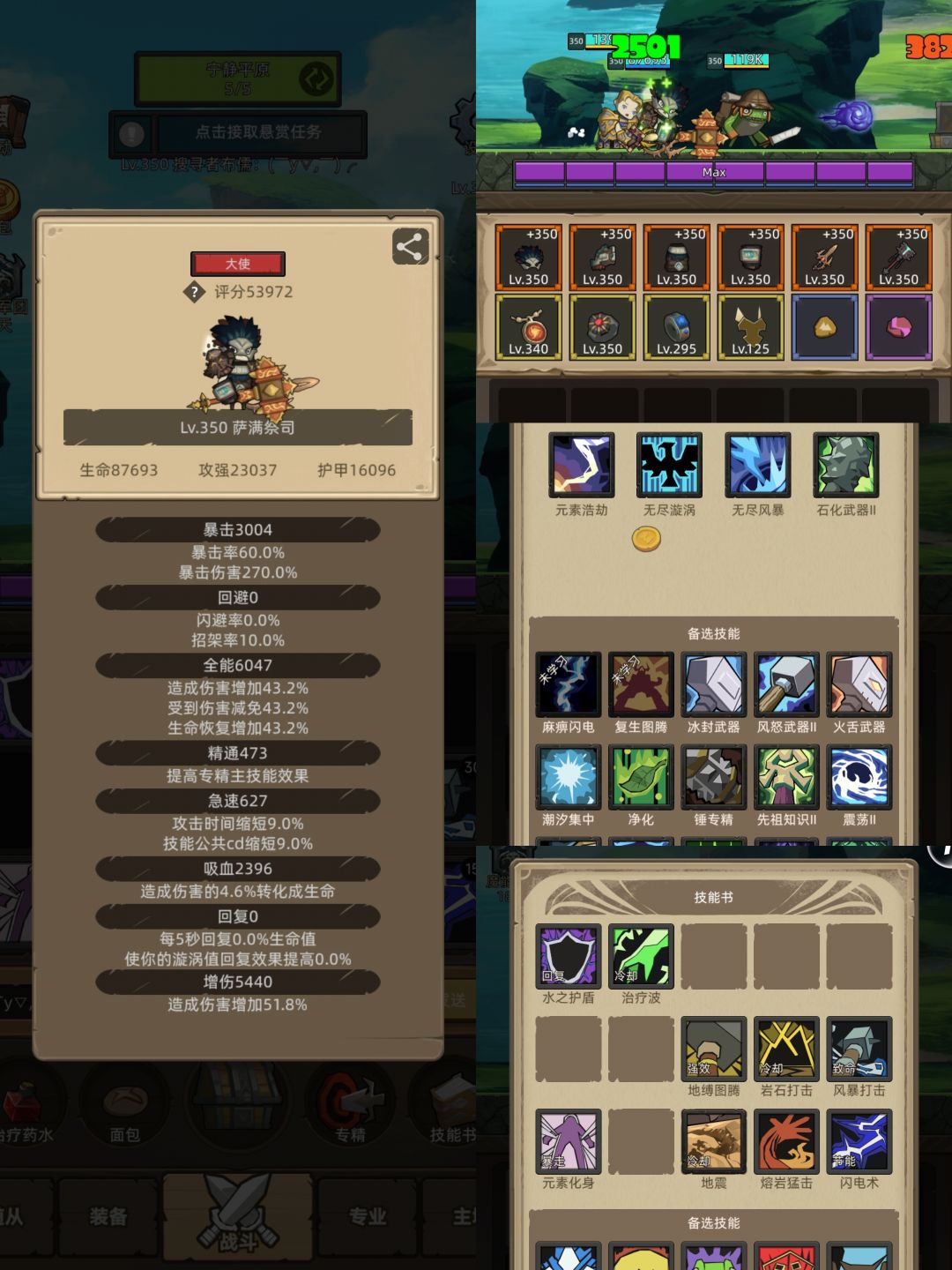 挂机的重点就是技能要少放。分不高打得不快,和奶萨比起来居然差不多。不过还是得研究下的,毕竟增强萨上限高,最后还得增强。(1、伤害高的应该不需要5回,项链和无尽风暴捆绑了没项链可以不用无尽风暴,不过这个组合伤害高)原本想普攻流但是技能CD太长,窗口期长。萨满控制多但都是软控,不过减速图腾和地震倒是挺合适3女的(再次吐槽图腾的范围真奇怪,一般情况下减速图腾只能覆盖一个三女)。剩下就是狗了,吸血高一点可以贴脸拼刀(现在基本确定了,挂机流能圆桌的圆桌,不能的就高吸血,当然还得配合少技能,相比之下圆桌职业都比较潇洒)减速图腾选择比较多,可以减CD5秒,延长5秒,然后换上风打25的饰品(我没有也不想换等增强红饰品)