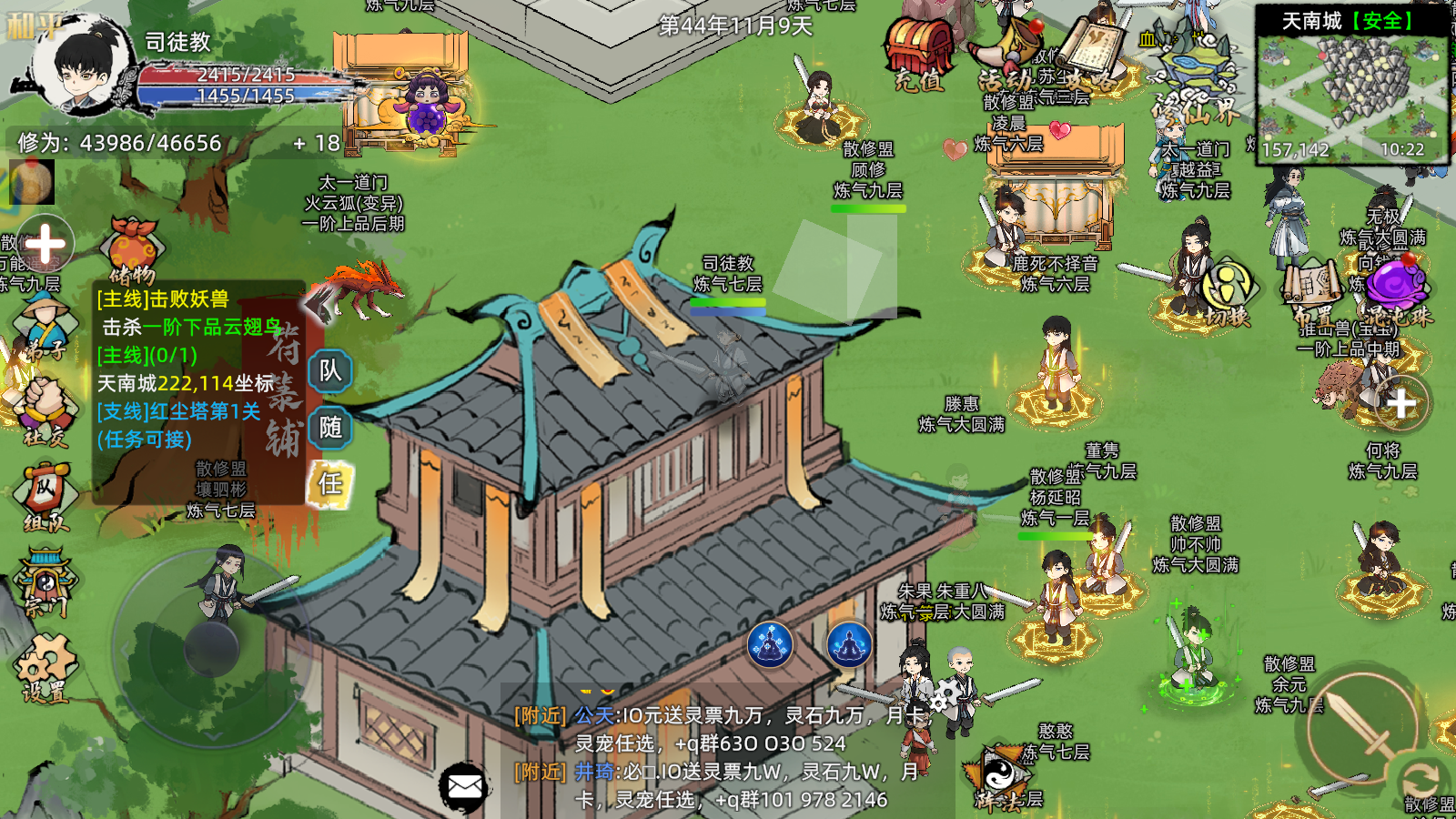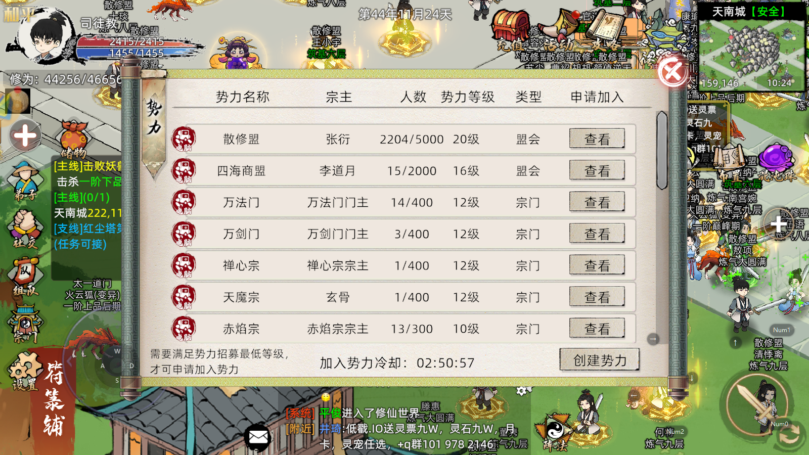 六、加入宗门,获取丰厚修炼资源在游戏界面的左侧,点击 “+” 号,就能看到宗门列表。对于新手玩家来说,散修盟是个不错的选择哦,这里欢迎每一位初入修仙世界的小伙伴。加入宗门后,各种修炼资源、强大的支持都会源源不断地到来,咱们的实力也能像坐火箭一样,快速提升。要是以后游戏玩得深入了,想换个宗门,也完全没问题,随时都能跳槽。