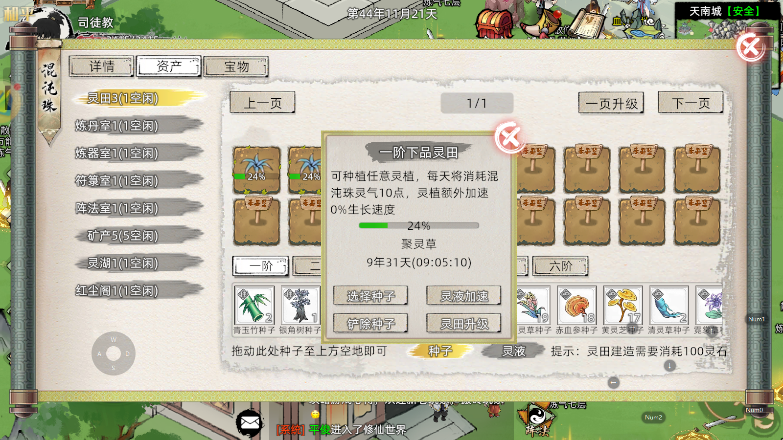 四、灵田种植聚灵草,修为快速提升还是在 “混沌珠” 里,点击进入 “资产”,就能看到灵田界面啦。在这里,咱们只要点击小木牌,就能轻松获得灵田。接着,把聚灵草种子撒下去,把 12 块田都种得满满的。这聚灵草可省心了,成熟后会自动收获再种植。咱们把它炼成聚灵丹,服用后修为就能蹭蹭往上涨。不过要注意哦,丹毒可别超过 800。要是等不及聚灵草成熟,也没关系,混沌珠里有个小绿瓶,用里面的灵水一喷,聚灵草立马就能催熟,是不是超方便?
