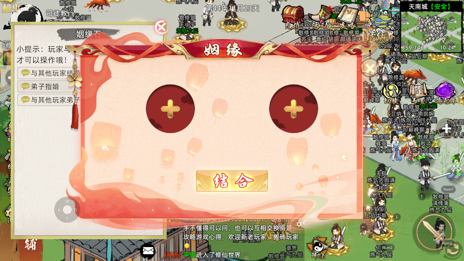 五、联姻生娃,传承修仙血脉来到主城中央传送阵的左下角,能看到姻缘石。这姻缘石可是家族血脉传承的关键哦。咱们先给弟子们安排好婚事,自己也别忘了找个修仙伴侣。剩下的弟子就两两配对,开启结婚生子的模式。婚后,点击弟子头像,进入 “关系” 选项,就能看到 “双修” 选项啦。咱们要根据弟子们的元气情况,合理安排双修,说不定哪天就会收获惊喜,迎来新生命。要是女弟子怀孕了,灵胎图标会亮起,咱们能清楚地看到孕育进度。等时间一到,手动点击诞生,一个可爱的修仙小宝贝就诞生啦。