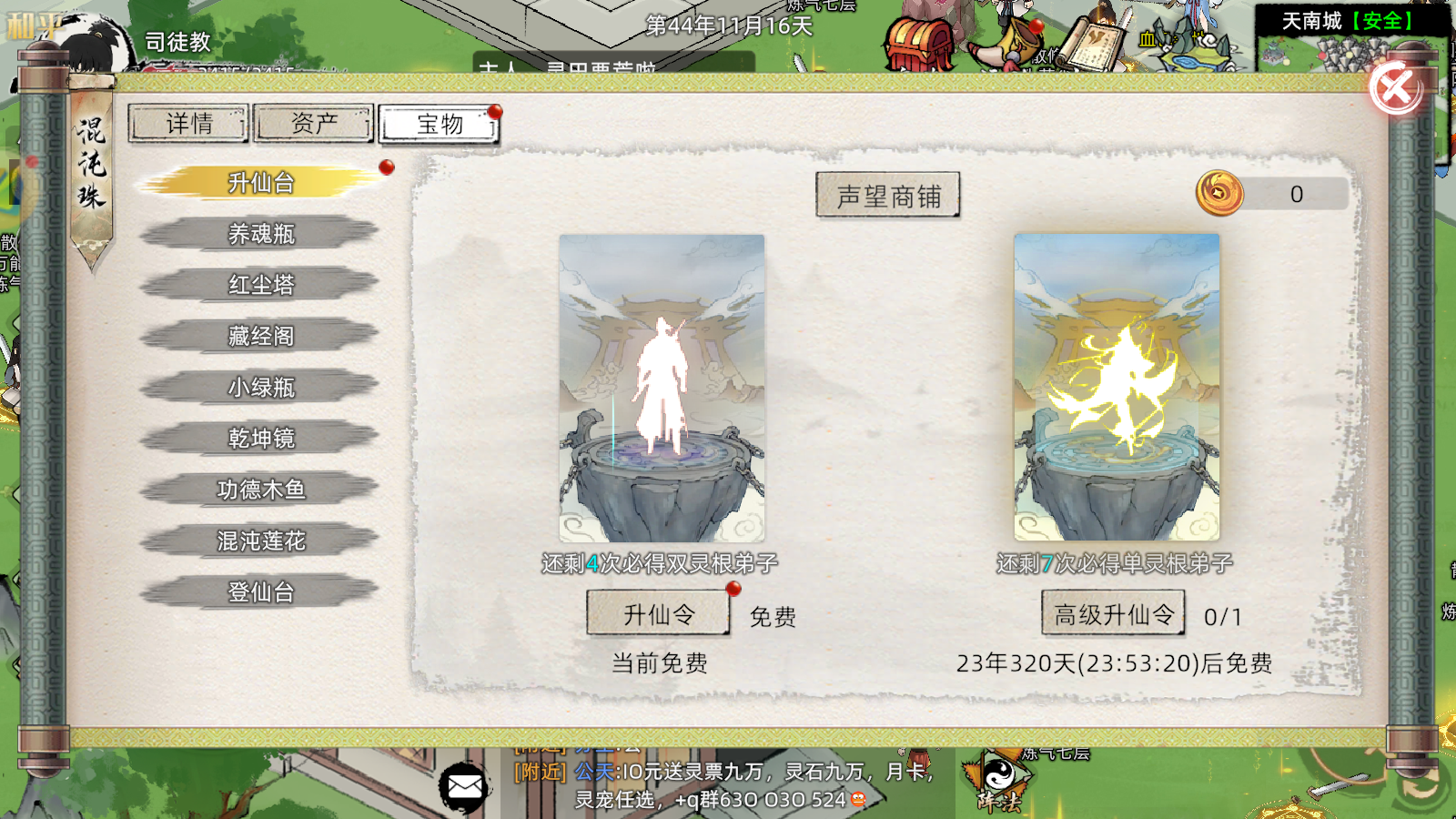 三、招兵买马,壮大修仙家族在游戏界面的右边,有个 “混沌珠” 图标,点击进去后,就像是打开了一个装满宝物的宝库。在升仙台上,咱们可以尽情使用高级升仙令、普通升仙令,看到合适的弟子就赶紧收入囊中。因为每个弟子都有可能成为家族未来的顶梁柱,潜力无限。还有哦,别忘了下面的混沌令,说不定运气爆棚,一抽就能抽到隐藏的修仙大佬,那可就赚大啦!