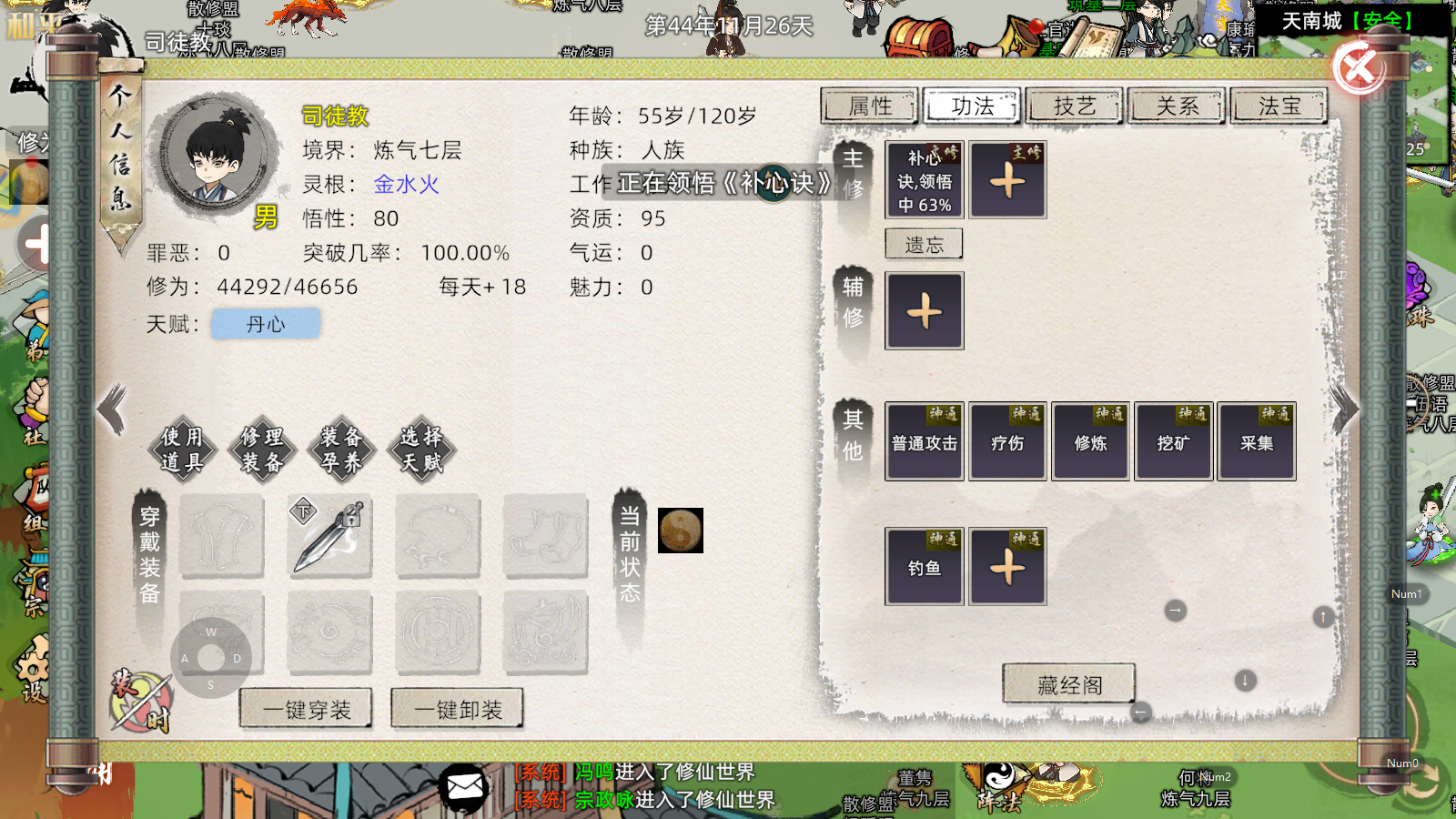 八、配置战斗技能,无惧任何挑战还是点击左侧的 “+” 号,进入设置界面,再找到技能设置。在这里,咱们把学会的技能直接拖到左侧的技能栏里,这样在战斗中就能快速施放技能,轻松应对敌人。还有哦,在 “特殊” 选项里,有打坐、疗伤、神识外放等技能,这些技能在修炼、疗伤、探索的时候都能派上大用场,可别忘了设置。要是修炼到练气四层,还能学习御器飞行技能,同样也是在这里进行配置哦。