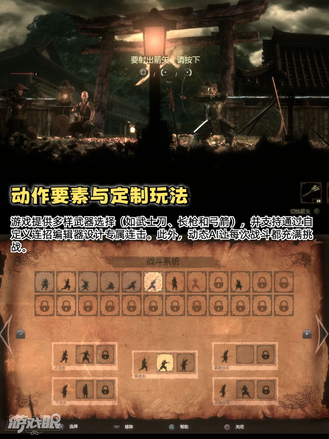 游戏提供多样武器选择(如武士刀、长枪和弓箭),并支持通过自定义连招编辑器设计专属连击。此外,动态AI让每次战斗都充满挑战。