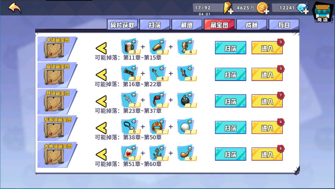 如果不是缺/想刷橙装,这些碎片可以一键扫荡,体力不够用的话,前四个藏宝图碎片可以不用扫