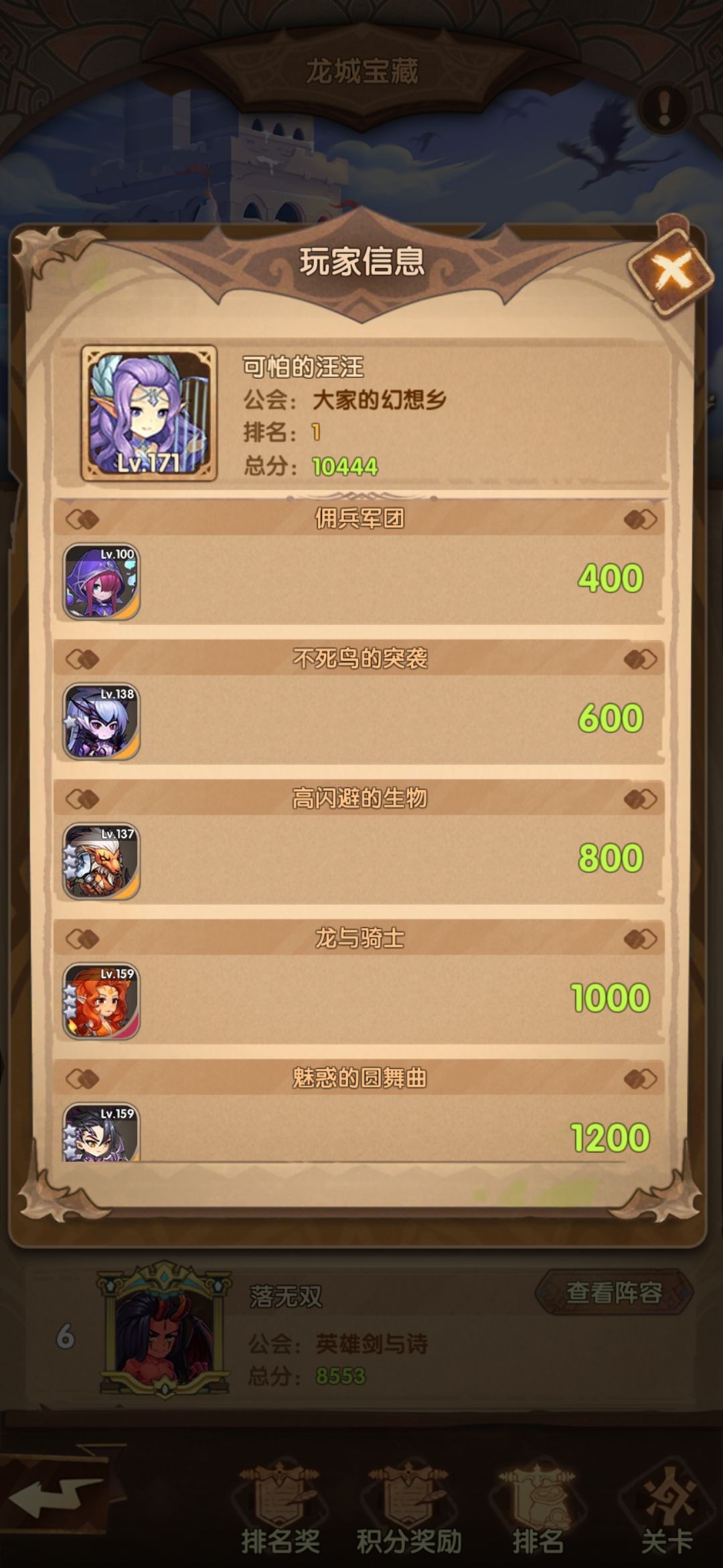 看图就知道思路了,稍微需要讲一下的大概是龙与骑士那关,思路就是直接拆家,召唤的小兵占王座。由于不热衷pvp(主要是太不平衡),所以资源都留着给龙城了,使得我等级虽然不低,但突破6很少,但并不影响龙城的战斗。
