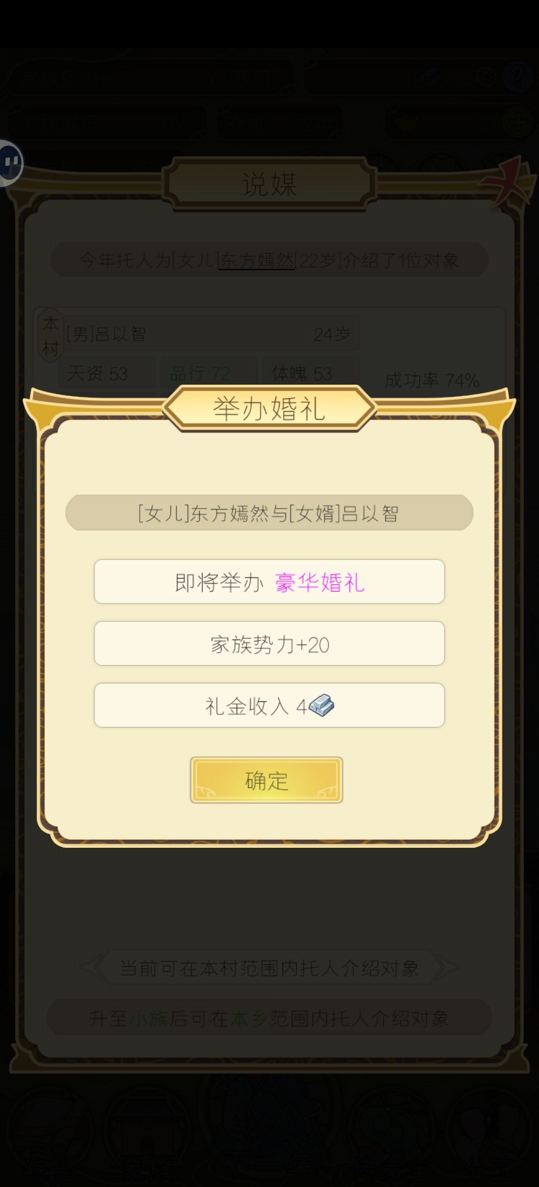 首先,开局点积极鼓励生育。然后你就能够获得元宝,接下来安排人结婚。前期的结婚率很高,可以都点免费。接下来再用元宝选择婚礼,就能够收获4两或者20两银子