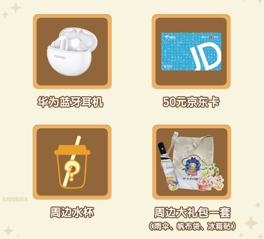 二、「发图有礼」:发卡皮巴拉萌图,赢华为耳机、京东卡大奖!